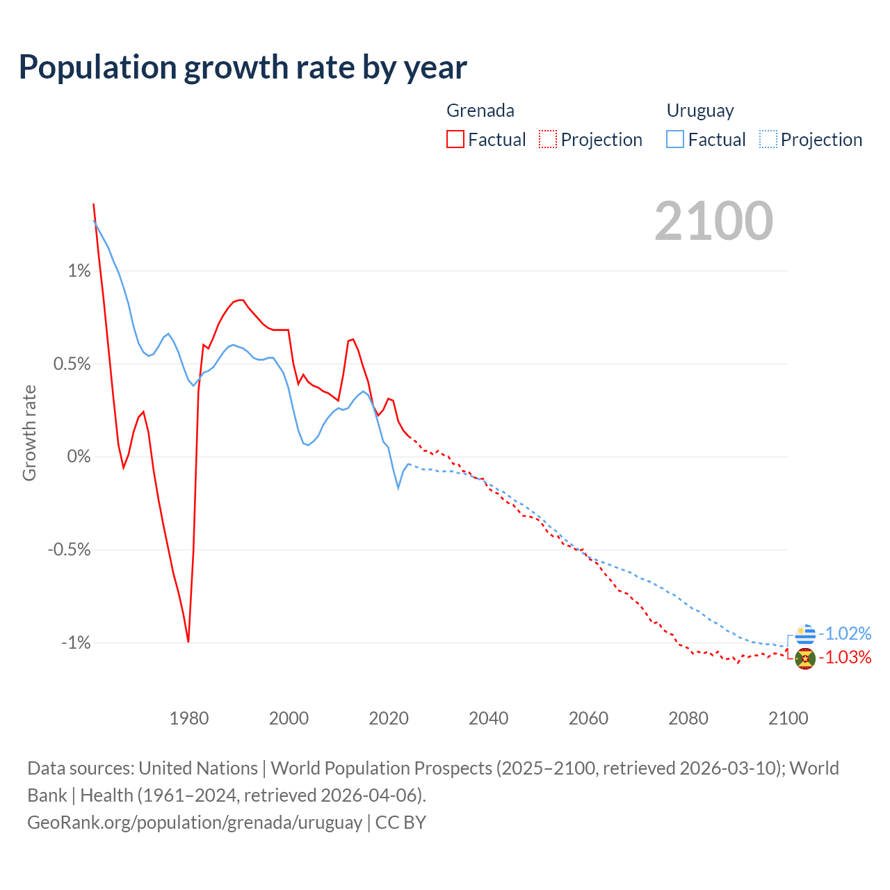 - For the last 10 years, Grenada has had an average growth rate of +0.29% per year vs +0.11% in Uruguay.