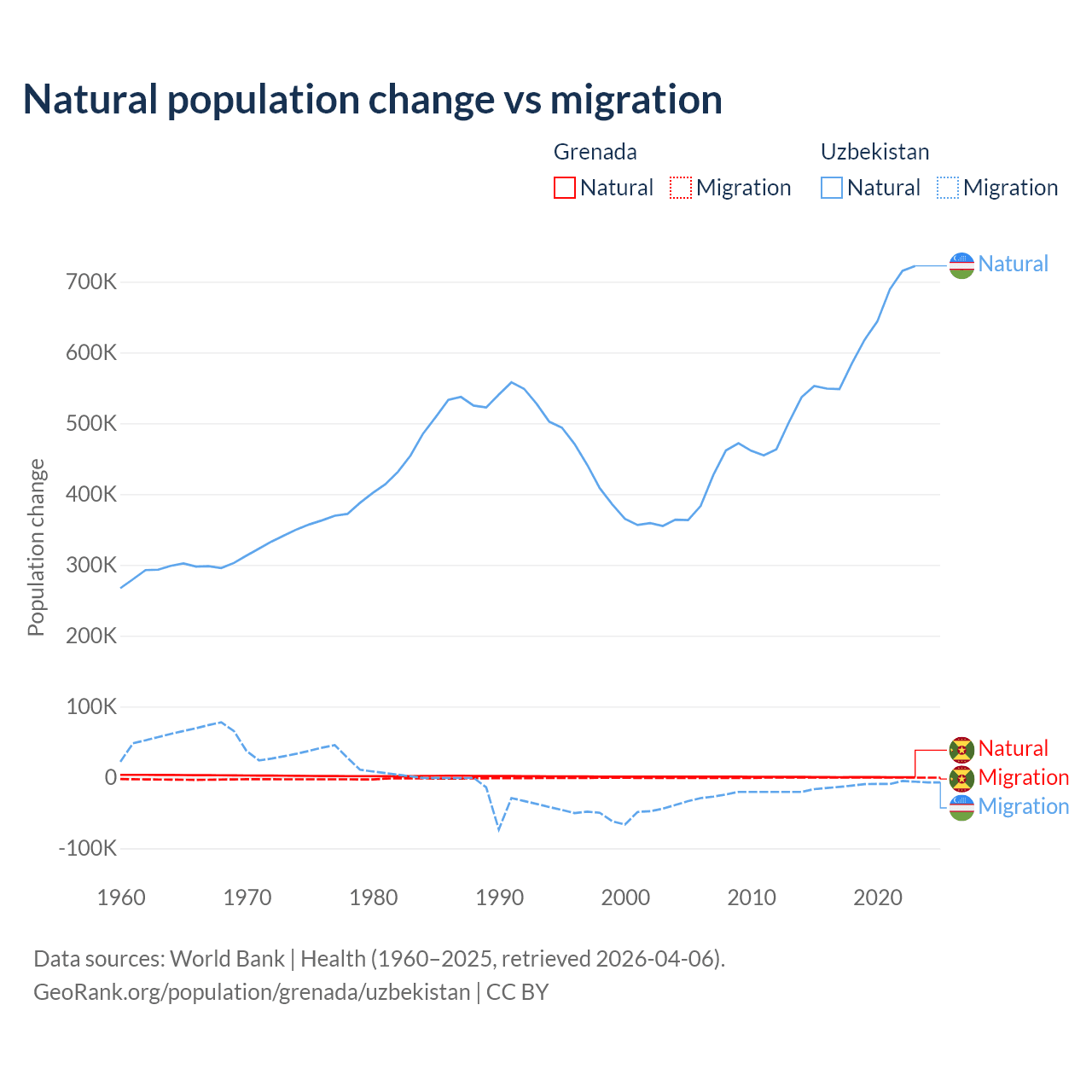 Over the last 10 years, 76% of the population change in Grenada is from natural causes (a gain of 4,850 people) and 24% is from migration (a loss of 1,535 people). In Uzbekistan 98.2% is from natural causes (a gain of 6,161,117 people) and 1.84% is from migration (a loss of 115,398 people).