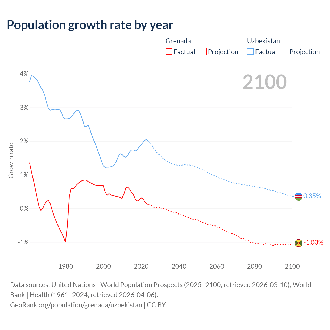 - For the last 10 years, Grenada has had an average growth rate of +0.29% per year vs +1.85% in Uzbekistan.