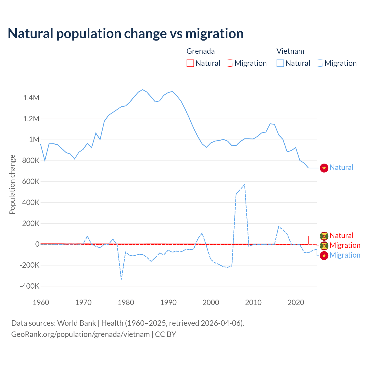 Over the last 10 years, 76% of the population change in Grenada is from natural causes (a gain of 4,850 people) and 24% is from migration (a loss of 1,535 people). In Vietnam 97.7% is from natural causes (a gain of 9,349,756 people) and 2.29% is from migration (a gain of 219,073 people).