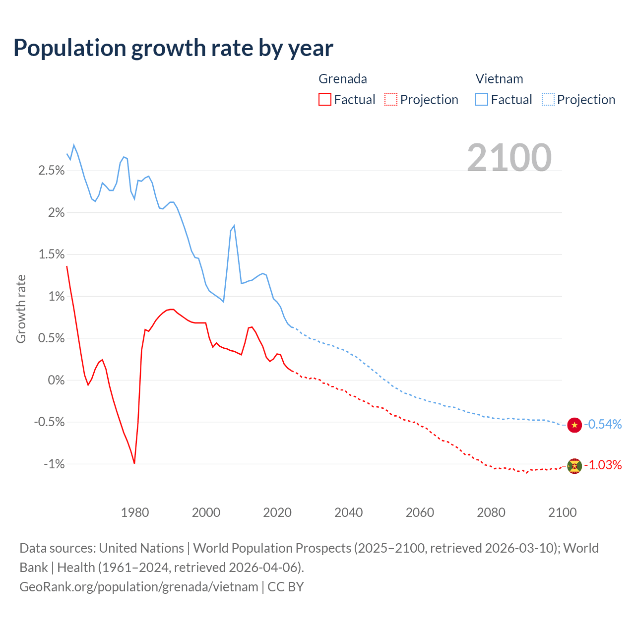- For the last 10 years, Grenada has had an average growth rate of +0.29% per year vs +0.99% in Vietnam.