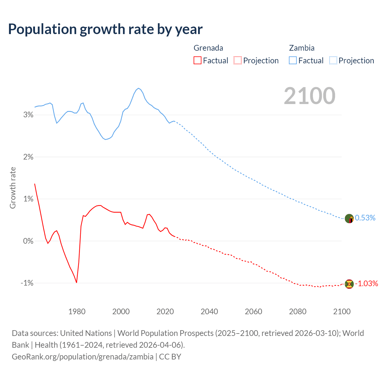 - For the last 10 years, Grenada has had an average growth rate of +0.29% per year vs +3% in Zambia.