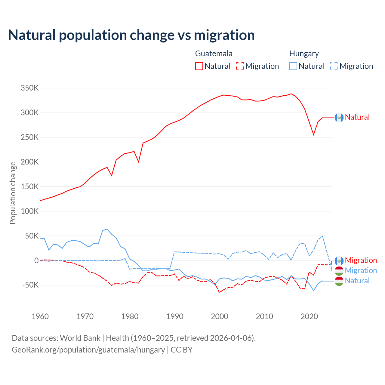 Over the last 10 years, 89.8% of the population change in Guatemala is from natural causes (a gain of 3,077,847 people) and 10.2% is from migration (a loss of 347,818 people). In Hungary 63.7% is from natural causes (a loss of 412,838 people) and 36.3% is from migration (a gain of 234,837 people).