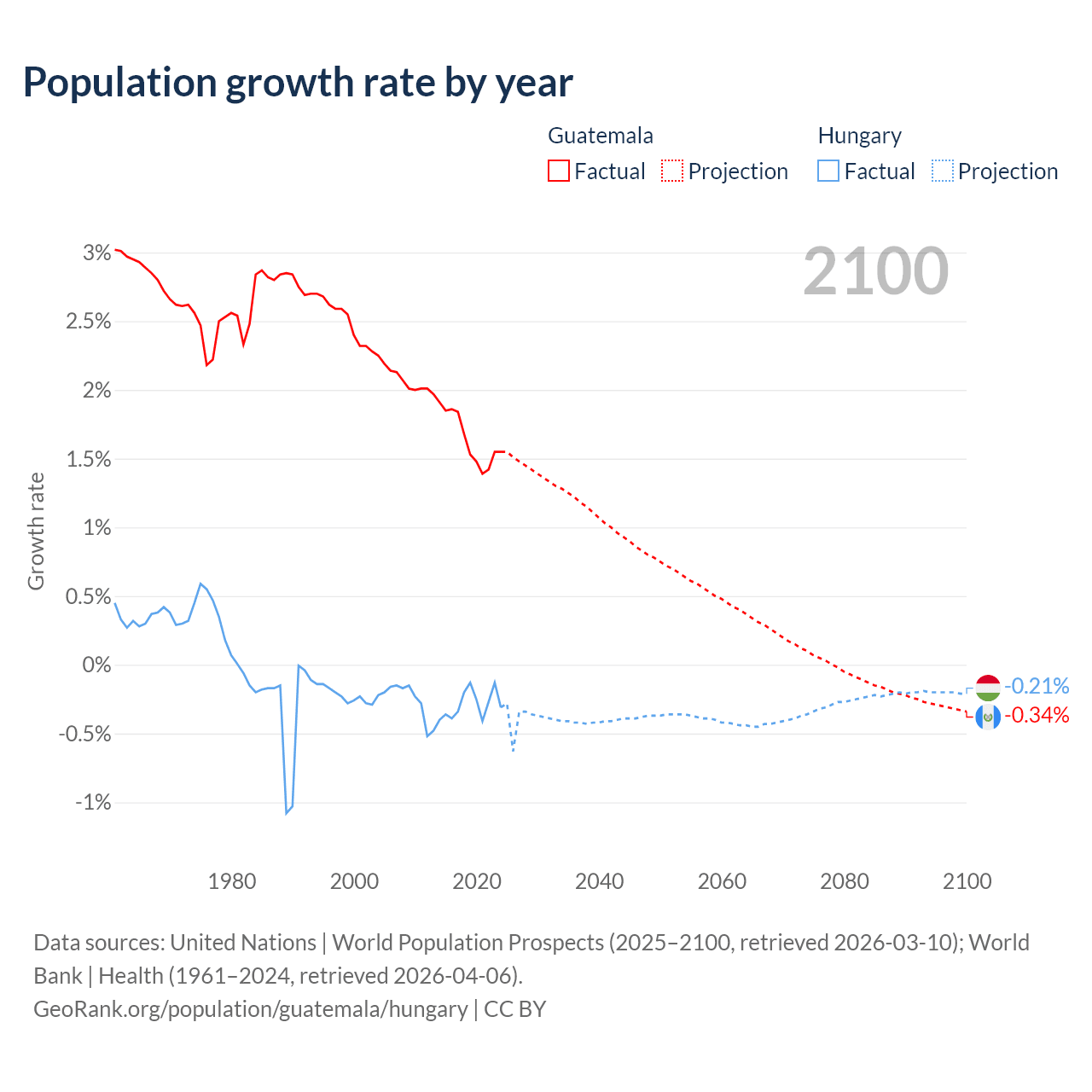 - For the last 10 years, Guatemala has had an average growth rate of +1.64% per year vs -0.29% in Hungary.