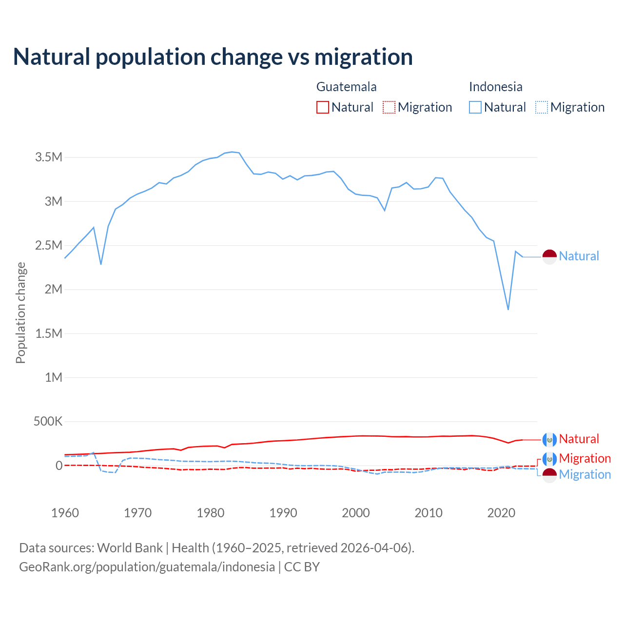 Over the last 10 years, 89.8% of the population change in Guatemala is from natural causes (a gain of 3,077,847 people) and 10.2% is from migration (a loss of 347,818 people). In Indonesia 98.9% is from natural causes (a gain of 25,242,860 people) and 1.1% is from migration (a loss of 280,258 people).