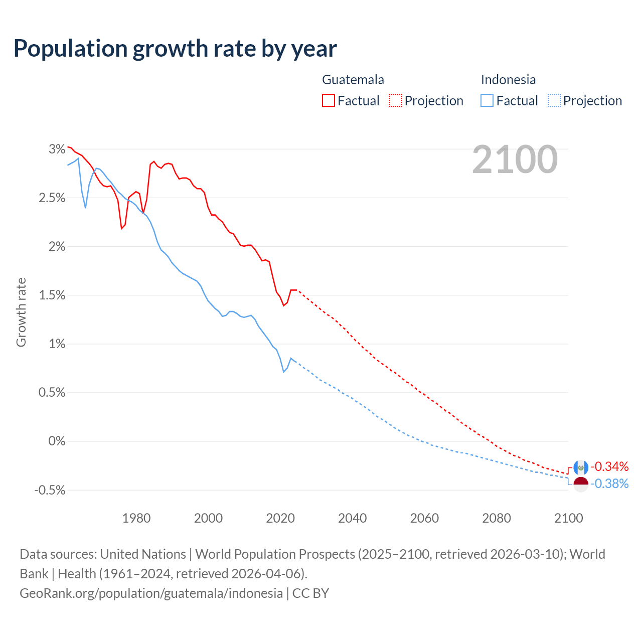 - For the last 10 years, Guatemala has had an average growth rate of +1.64% per year vs +0.94% in Indonesia.