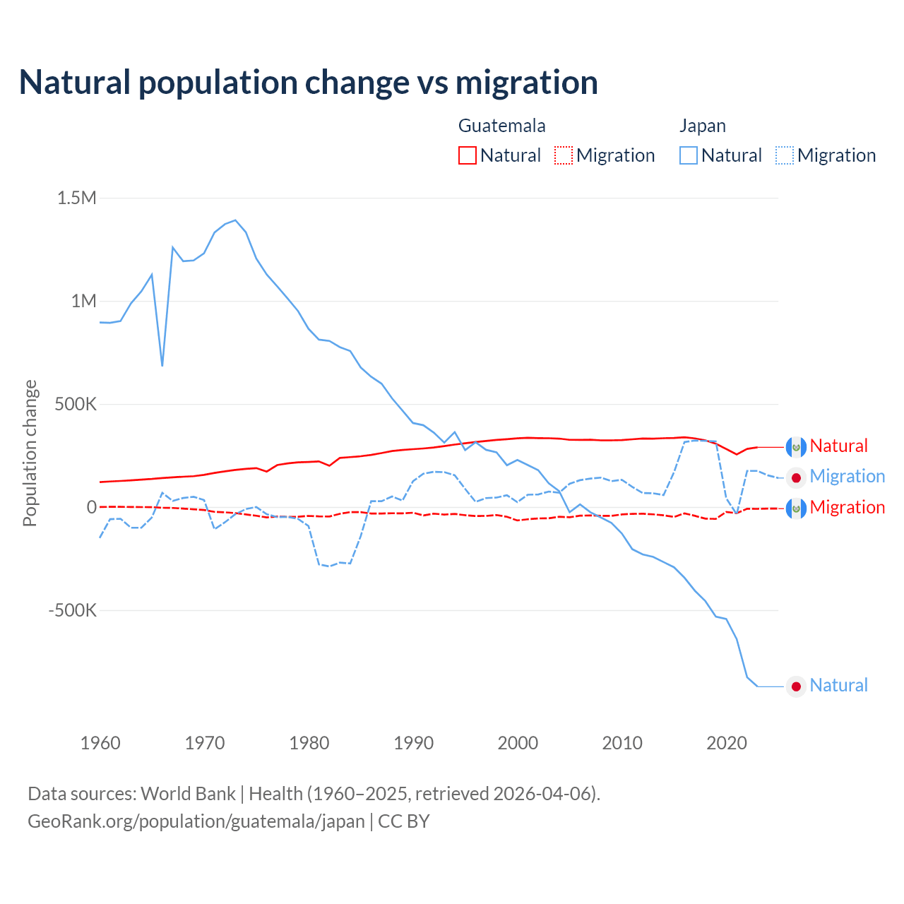 Over the last 10 years, 89.8% of the population change in Guatemala is from natural causes (a gain of 3,077,847 people) and 10.2% is from migration (a loss of 347,818 people). In Japan 73.6% is from natural causes (a loss of 5,178,838 people) and 26.4% is from migration (a gain of 1,860,103 people).