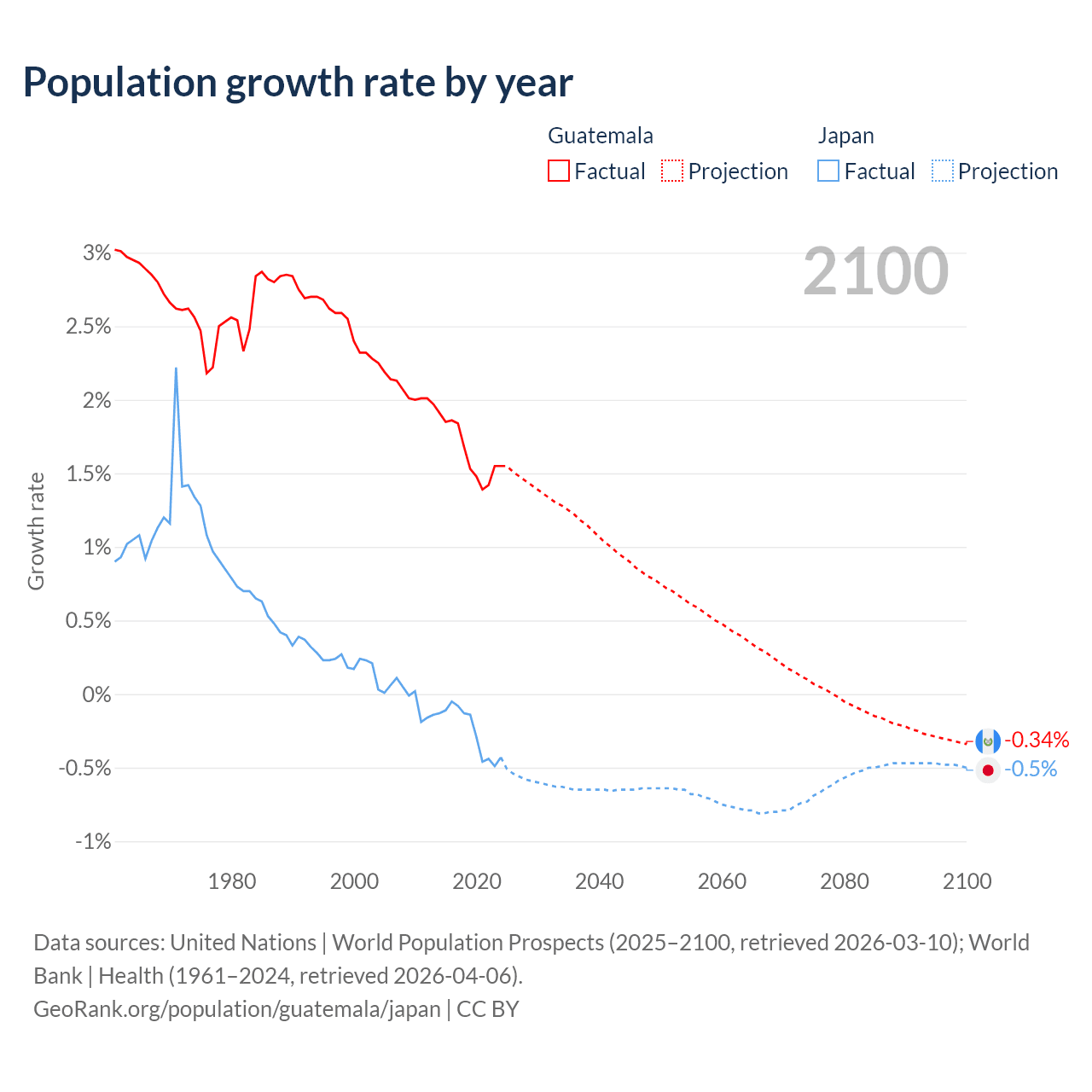 - For the last 10 years, Guatemala has had an average growth rate of +1.64% per year vs -0.25% in Japan.