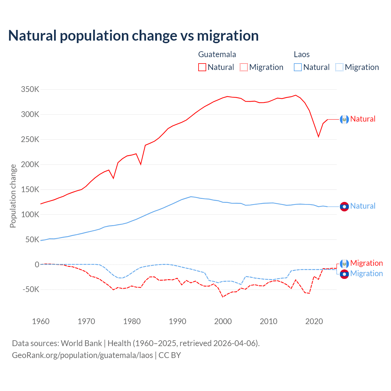 Over the last 10 years, 89.8% of the population change in Guatemala is from natural causes (a gain of 3,077,847 people) and 10.2% is from migration (a loss of 347,818 people). In Laos 90.6% is from natural causes (a gain of 1,183,013 people) and 9.41% is from migration (a loss of 122,899 people).