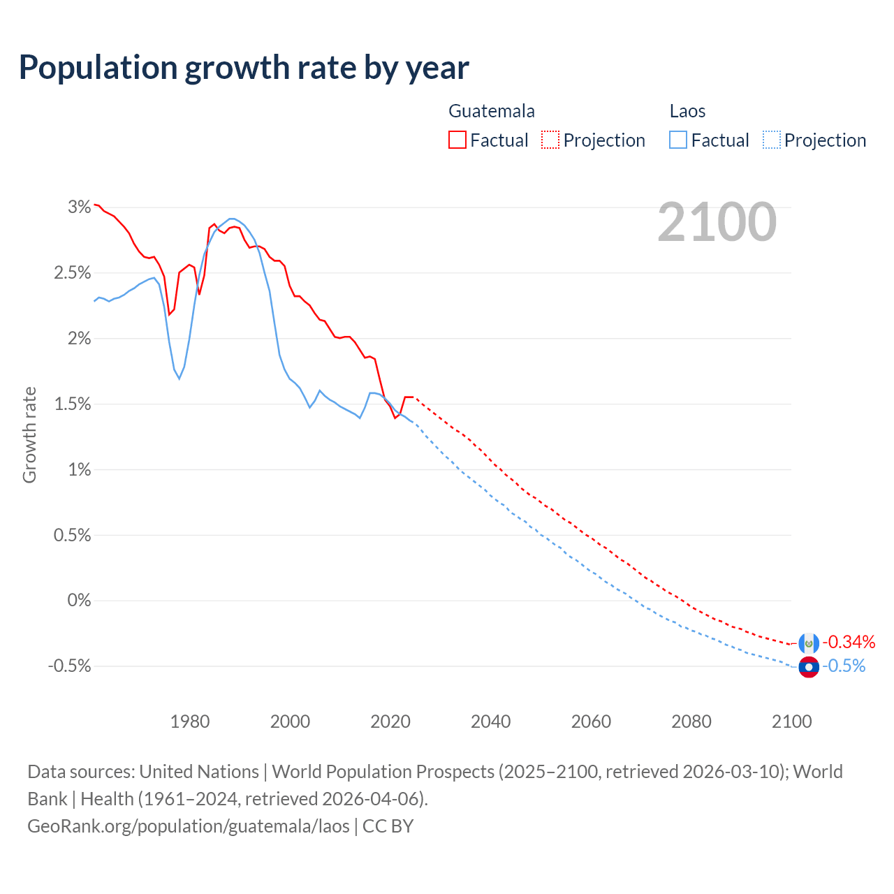 - For the last 10 years, Guatemala has had an average growth rate of +1.64% per year vs +1.48% in Laos.