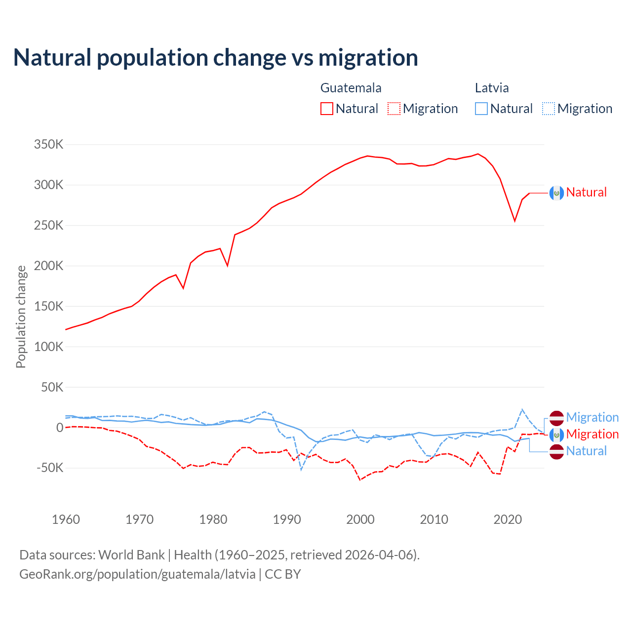 Over the last 10 years, 89.8% of the population change in Guatemala is from natural causes (a gain of 3,077,847 people) and 10.2% is from migration (a loss of 347,818 people). In Latvia 82.7% is from natural causes (a loss of 103,711 people) and 17.3% is from migration (a loss of 21,641 people).