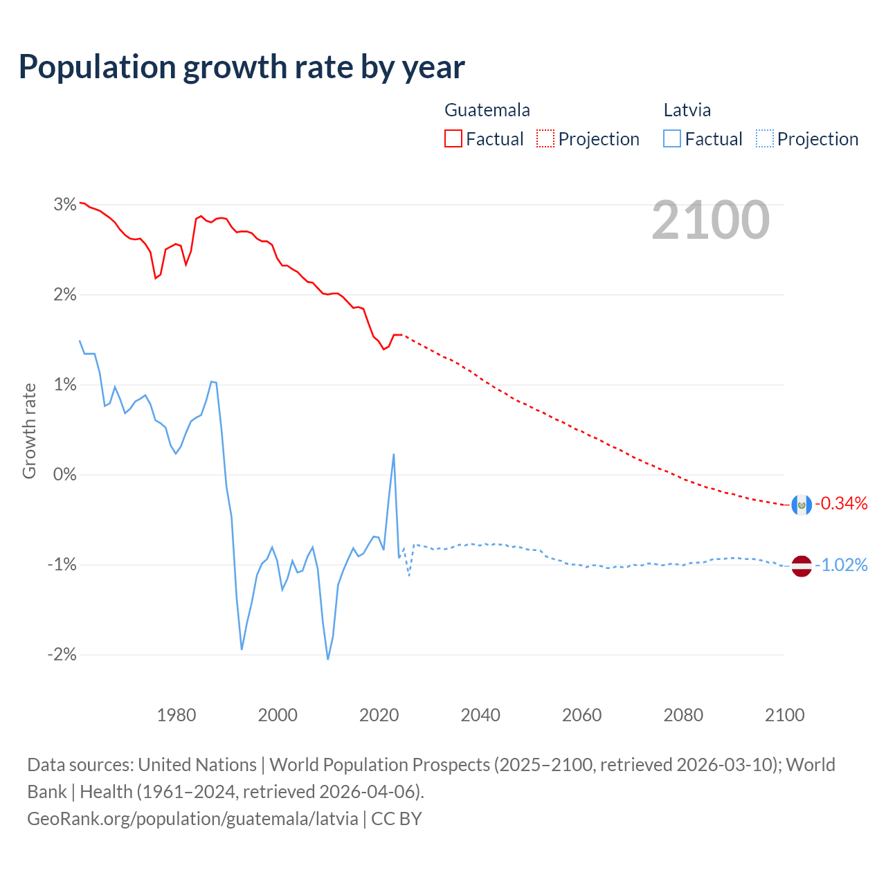 - For the last 10 years, Guatemala has had an average growth rate of +1.64% per year vs -0.68% in Latvia.