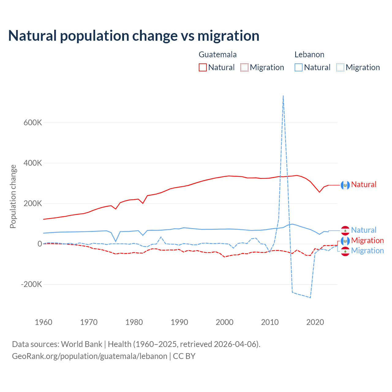 Over the last 10 years, 89.8% of the population change in Guatemala is from natural causes (a gain of 3,077,847 people) and 10.2% is from migration (a loss of 347,818 people). In Lebanon 40.1% is from natural causes (a gain of 739,256 people) and 59.9% is from migration (a loss of 1,103,772 people).