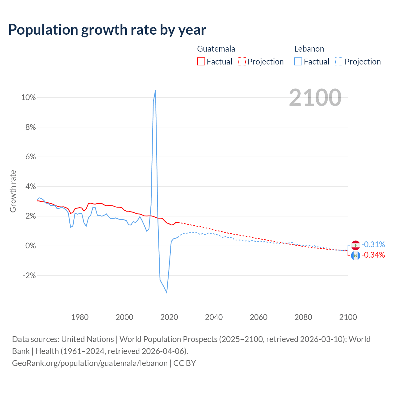 - For the last 10 years, Guatemala has had an average growth rate of +1.64% per year vs +0.16% in Lebanon.