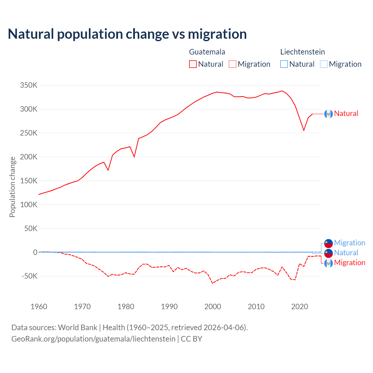 Over the last 10 years, 89.8% of the population change in Guatemala is from natural causes (a gain of 3,077,847 people) and 10.2% is from migration (a loss of 347,818 people). In Liechtenstein 32.4% is from natural causes (a gain of 883 people) and 67.6% is from migration (a gain of 1,843 people).
