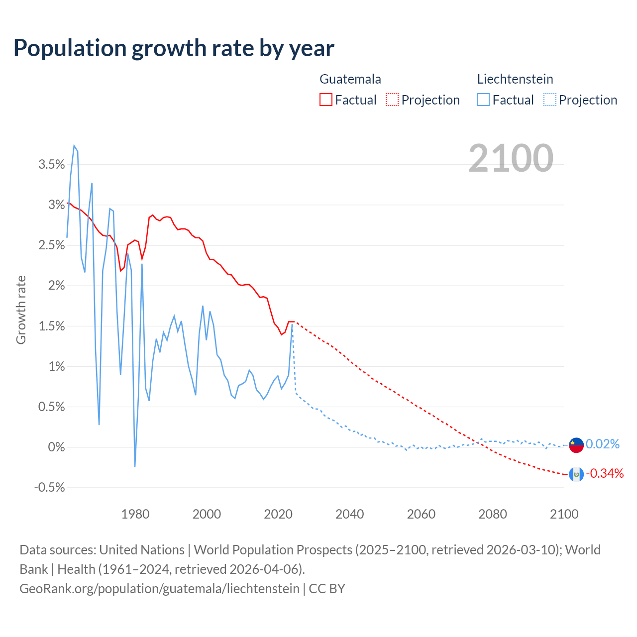 - For the last 10 years, Guatemala has had an average growth rate of +1.64% per year vs +0.82% in Liechtenstein.