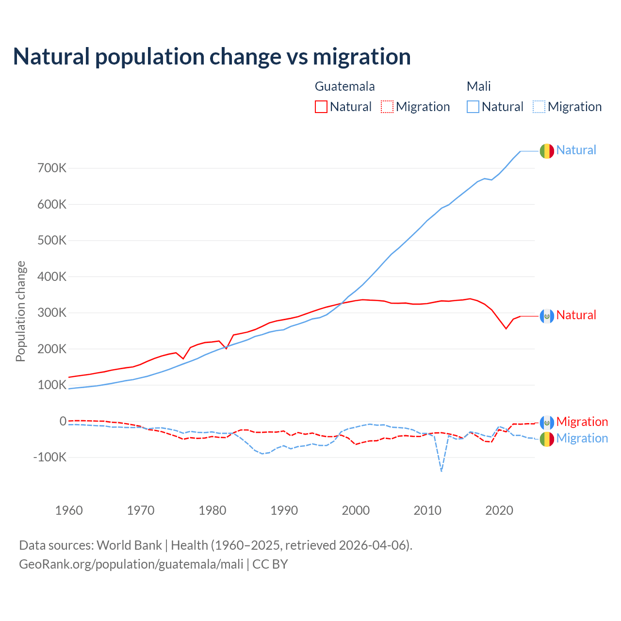 Over the last 10 years, 89.8% of the population change in Guatemala is from natural causes (a gain of 3,077,847 people) and 10.2% is from migration (a loss of 347,818 people). In Mali 94.9% is from natural causes (a gain of 6,749,473 people) and 5.13% is from migration (a loss of 365,292 people).