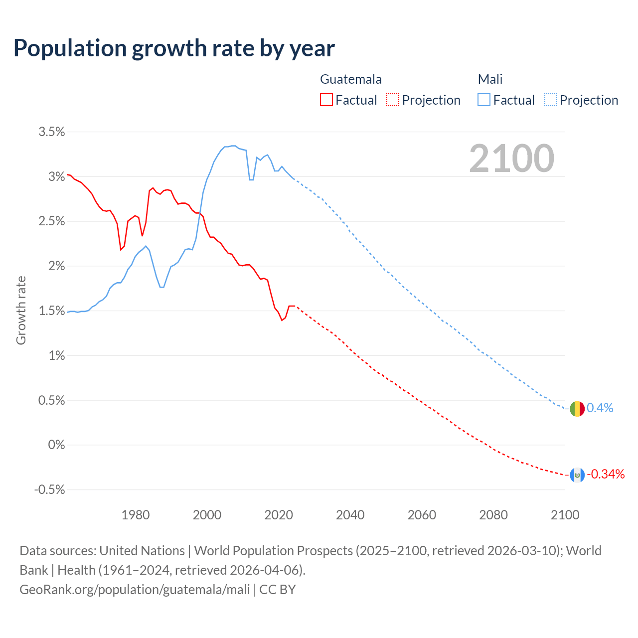 - For the last 10 years, Guatemala has had an average growth rate of +1.64% per year vs +3.12% in Mali.