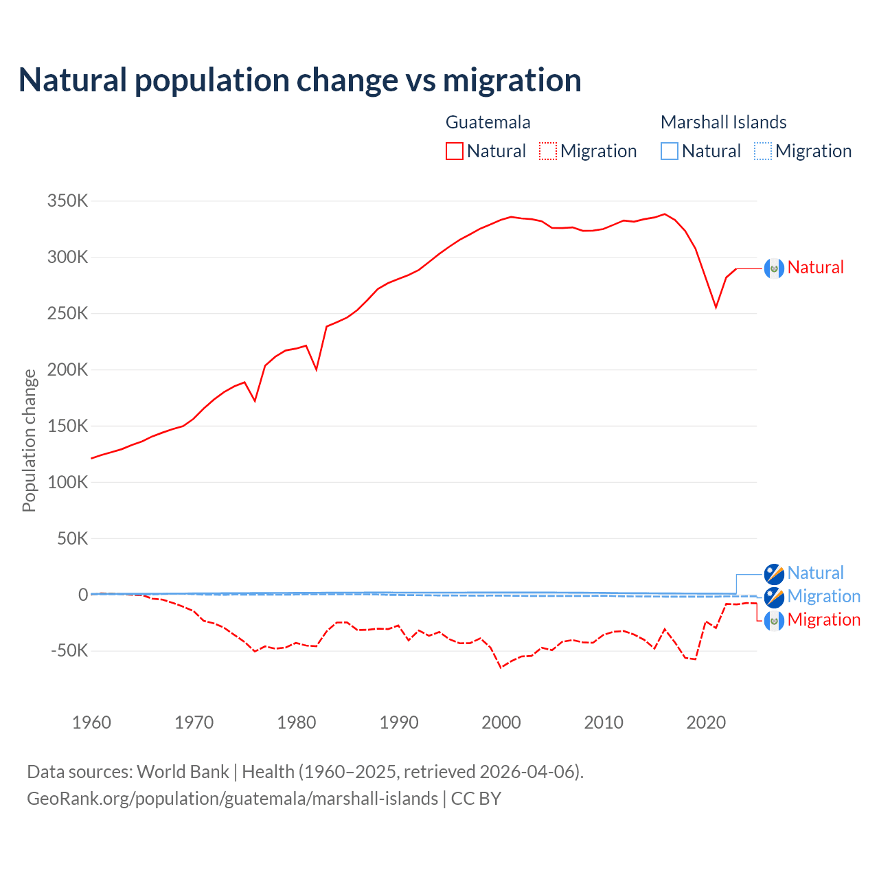 Over the last 10 years, 89.8% of the population change in Guatemala is from natural causes (a gain of 3,077,847 people) and 10.2% is from migration (a loss of 347,818 people). In the Marshall Islands 27.8% is from natural causes (a gain of 7,592 people) and 72.2% is from migration (a loss of 19,682 people).