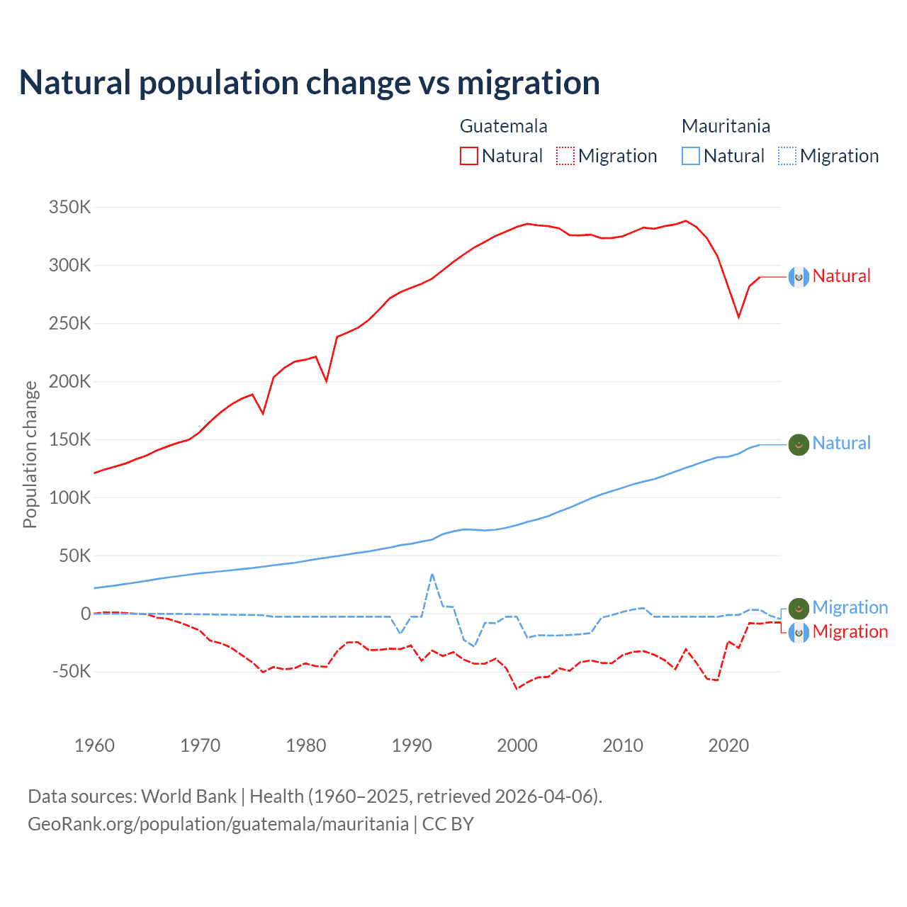 Over the last 10 years, 89.8% of the population change in Guatemala is from natural causes (a gain of 3,077,847 people) and 10.2% is from migration (a loss of 347,818 people). In Mauritania 98.9% is from natural causes (a gain of 1,320,903 people) and 1.12% is from migration (a loss of 14,982 people).