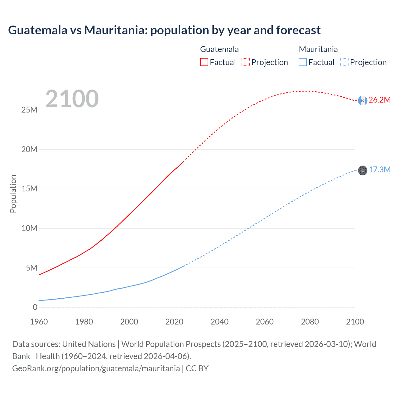 The latest officially reported population of Guatemala was 18,406,359 in 2024 vs 5,169,395 people in Mauritania in 2024. In 2026, based on the adjusted UN estimation, the current Guatemala's population is 19,049,936 people compared to 5,505,206 in Mauritania.