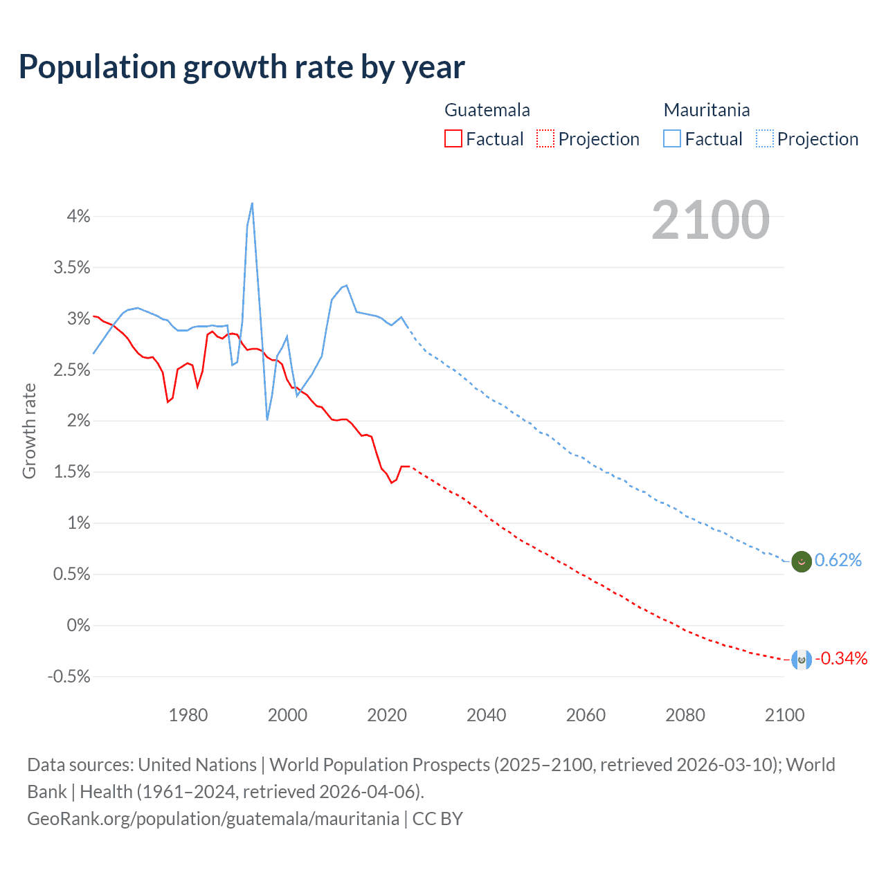 - For the last 10 years, Guatemala has had an average growth rate of +1.64% per year vs +3% in Mauritania.