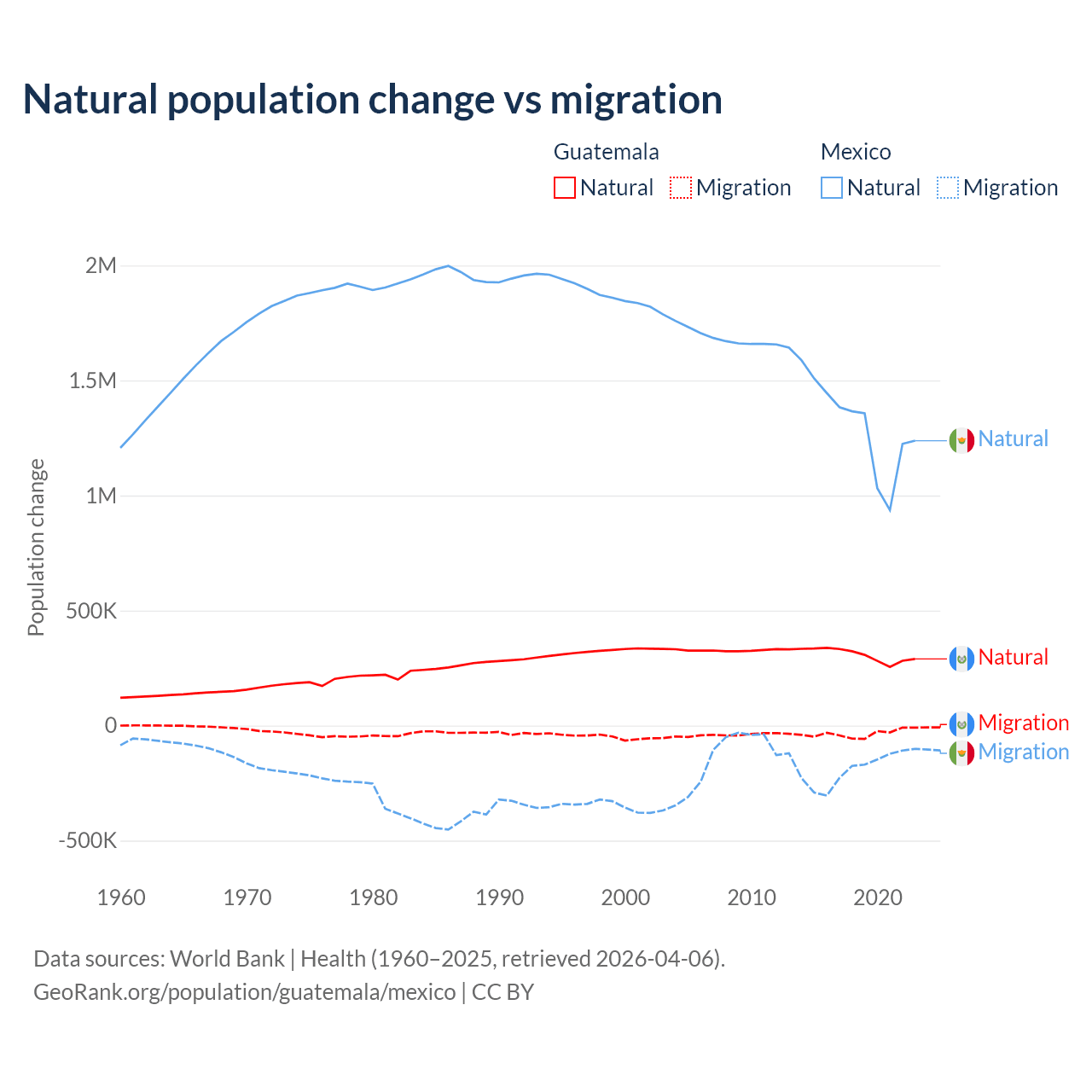 Over the last 10 years, 89.8% of the population change in Guatemala is from natural causes (a gain of 3,077,847 people) and 10.2% is from migration (a loss of 347,818 people). In Mexico 87.5% is from natural causes (a gain of 13,080,136 people) and 12.5% is from migration (a loss of 1,876,544 people).
