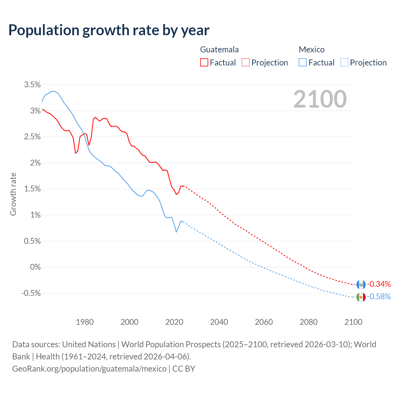 - For the last 10 years, Guatemala has had an average growth rate of +1.64% per year vs +0.92% in Mexico.