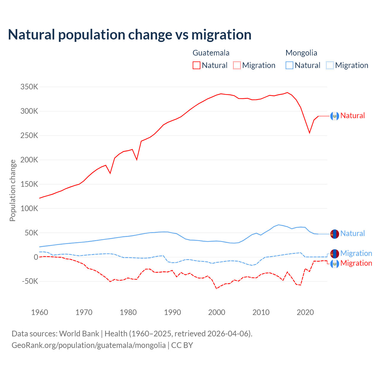 Over the last 10 years, 89.8% of the population change in Guatemala is from natural causes (a gain of 3,077,847 people) and 10.2% is from migration (a loss of 347,818 people). In Mongolia 94.1% is from natural causes (a gain of 580,367 people) and 5.87% is from migration (a gain of 36,163 people).