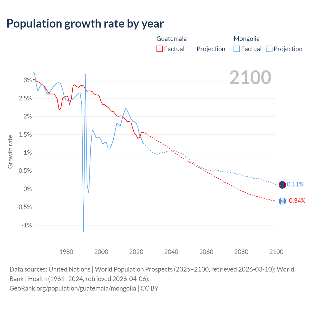 - For the last 10 years, Guatemala has had an average growth rate of +1.64% per year vs +1.79% in Mongolia.