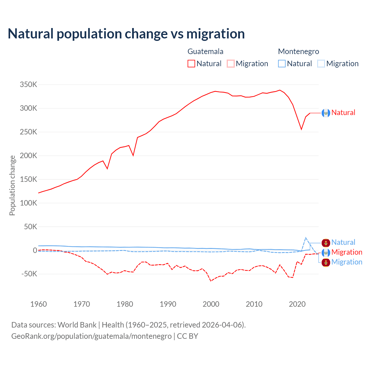 Over the last 10 years, 89.8% of the population change in Guatemala is from natural causes (a gain of 3,077,847 people) and 10.2% is from migration (a loss of 347,818 people). In Montenegro 52.4% is from natural causes (a gain of 4,501 people) and 47.6% is from migration (a gain of 4,095 people).
