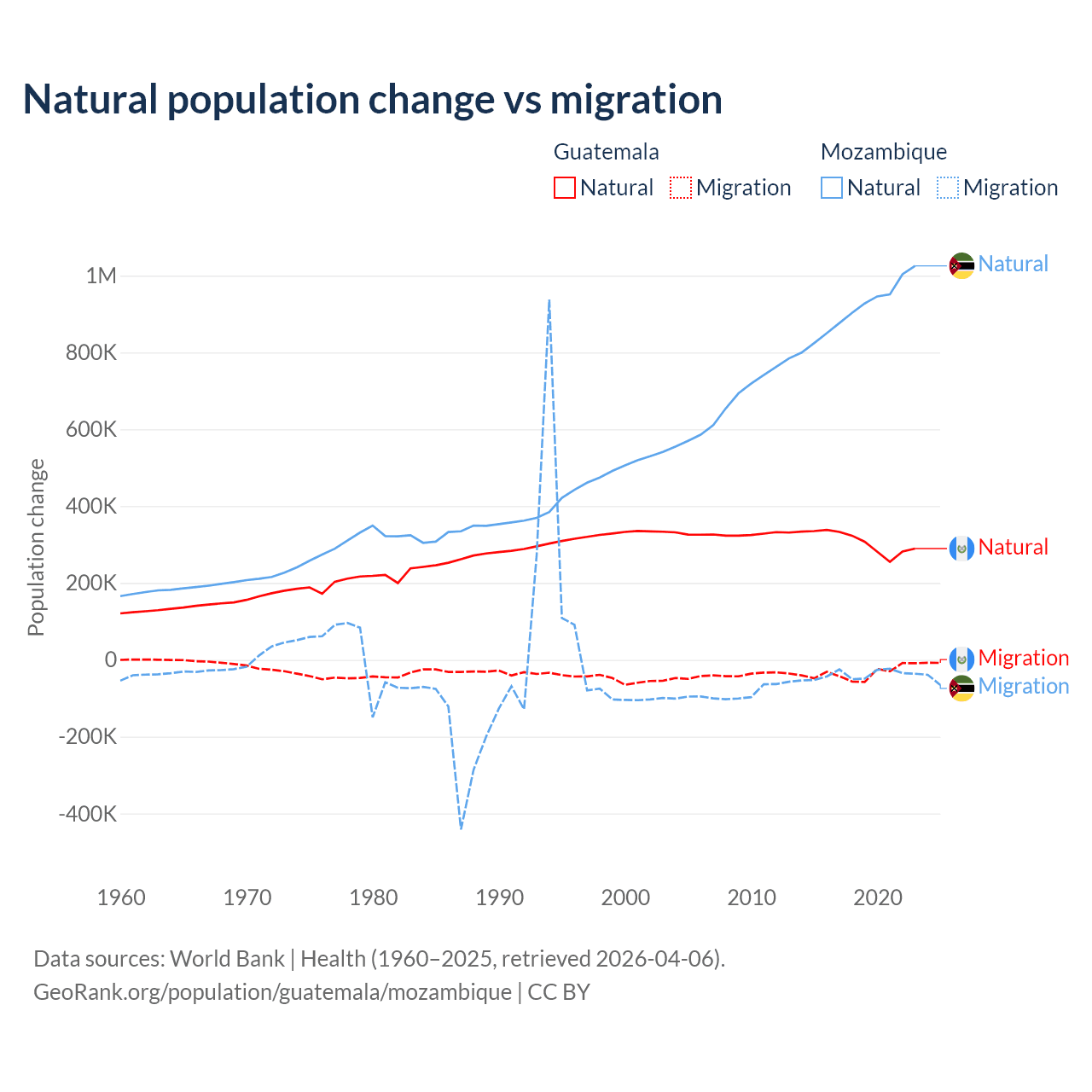 Over the last 10 years, 89.8% of the population change in Guatemala is from natural causes (a gain of 3,077,847 people) and 10.2% is from migration (a loss of 347,818 people). In Mozambique 95.9% is from natural causes (a gain of 9,108,203 people) and 4.15% is from migration (a loss of 393,923 people).