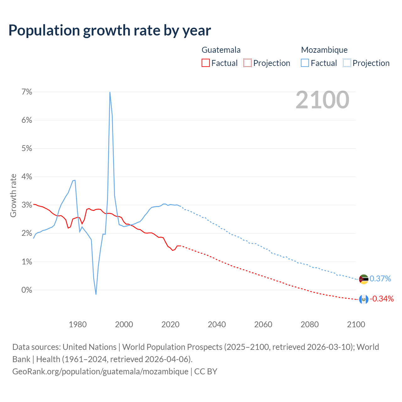 - For the last 10 years, Guatemala has had an average growth rate of +1.64% per year vs +2.99% in Mozambique.