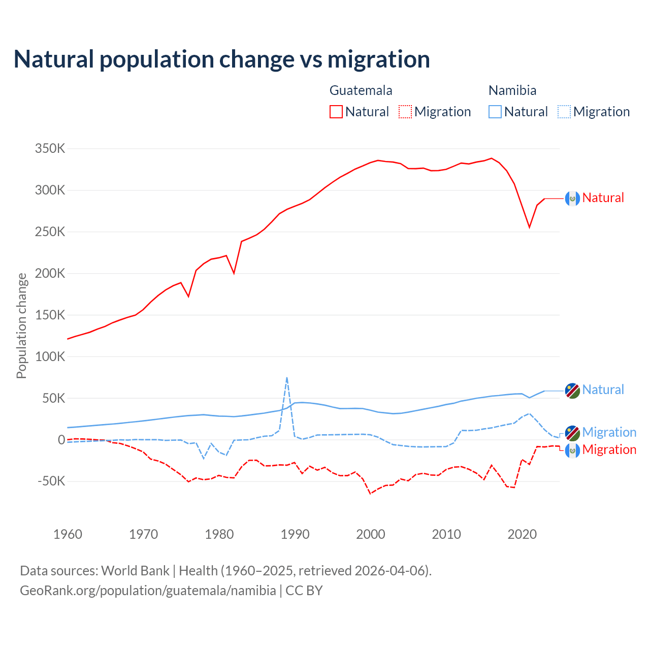 Over the last 10 years, 89.8% of the population change in Guatemala is from natural causes (a gain of 3,077,847 people) and 10.2% is from migration (a loss of 347,818 people). In Namibia 74.3% is from natural causes (a gain of 532,532 people) and 25.7% is from migration (a gain of 183,837 people).
