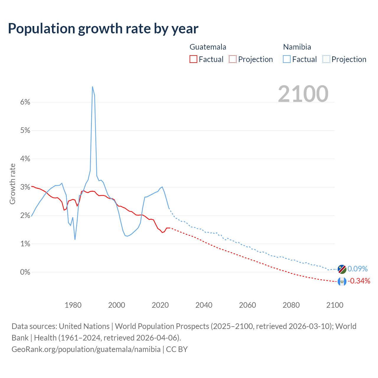 - For the last 10 years, Guatemala has had an average growth rate of +1.64% per year vs +2.73% in Namibia.