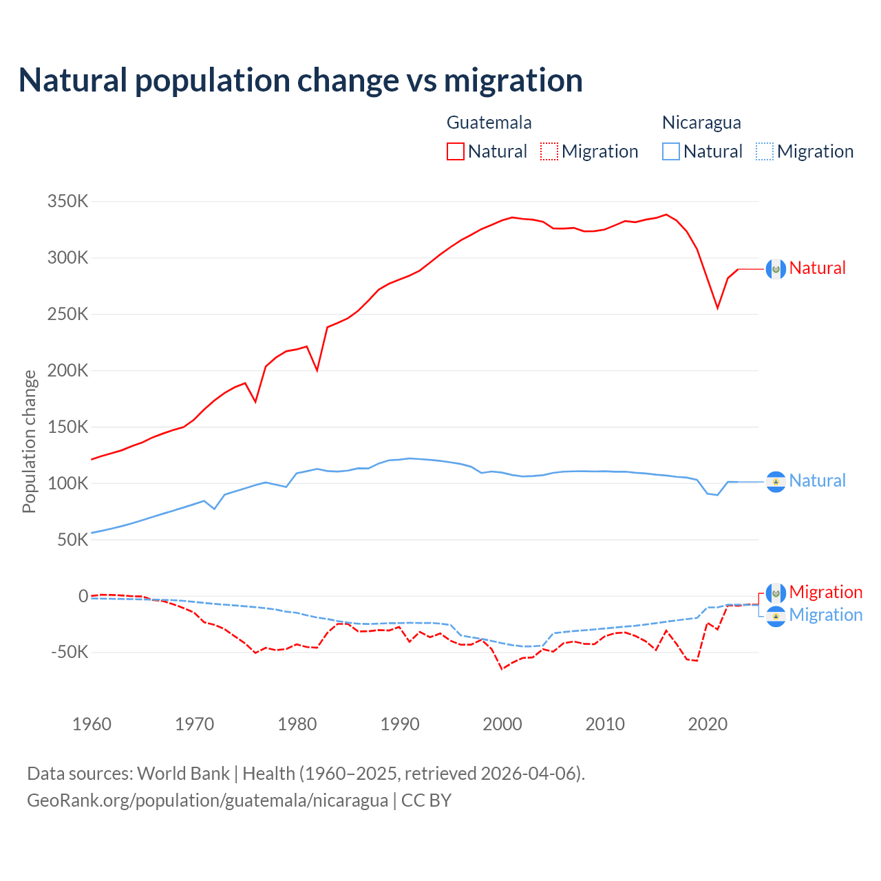 Over the last 10 years, 89.8% of the population change in Guatemala is from natural causes (a gain of 3,077,847 people) and 10.2% is from migration (a loss of 347,818 people). In Nicaragua 85.5% is from natural causes (a gain of 1,017,084 people) and 14.5% is from migration (a loss of 172,078 people).