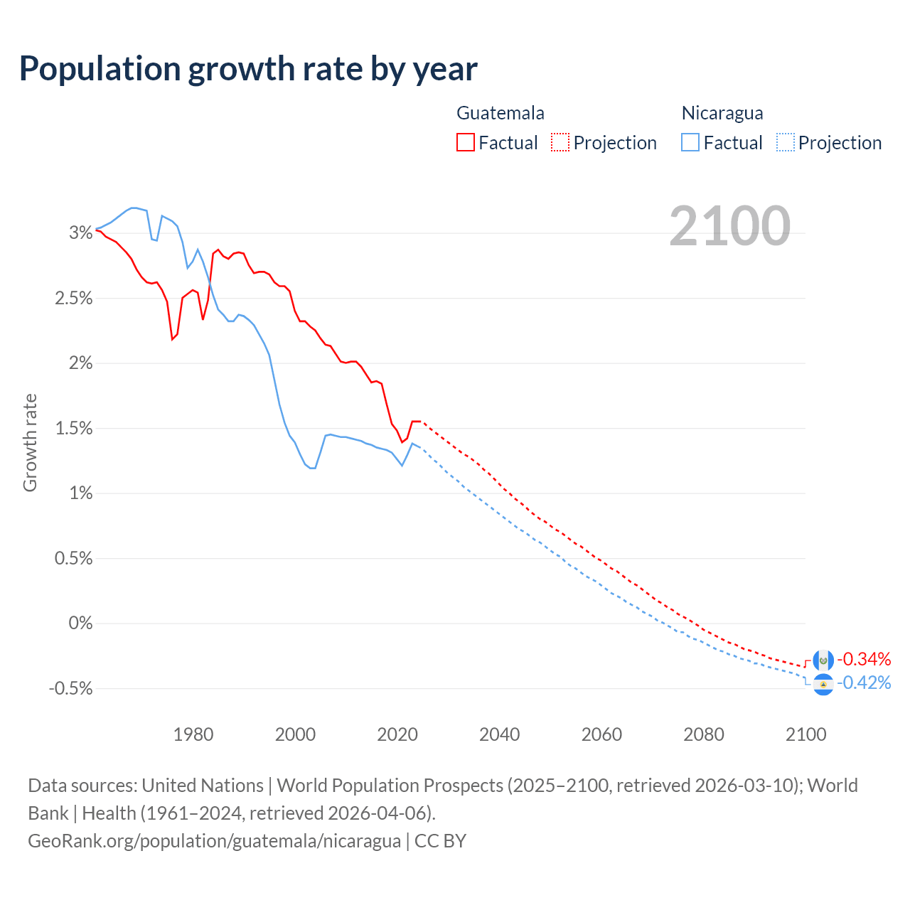 - For the last 10 years, Guatemala has had an average growth rate of +1.64% per year vs +1.33% in Nicaragua.