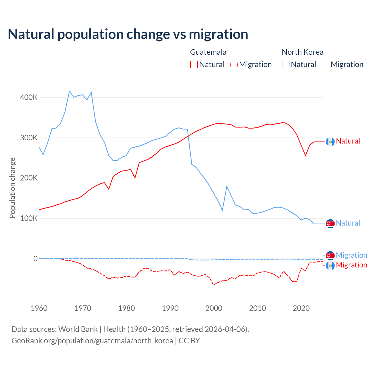 Over the last 10 years, 89.8% of the population change in Guatemala is from natural causes (a gain of 3,077,847 people) and 10.2% is from migration (a loss of 347,818 people). In North Korea 97.7% is from natural causes (a gain of 1,097,372 people) and 2.33% is from migration (a loss of 26,227 people).