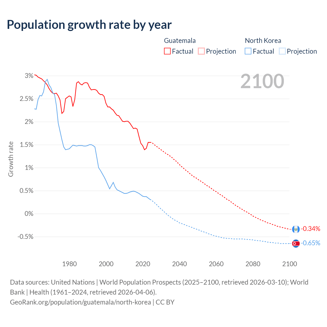 - For the last 10 years, Guatemala has had an average growth rate of +1.64% per year vs +0.41% in North Korea.