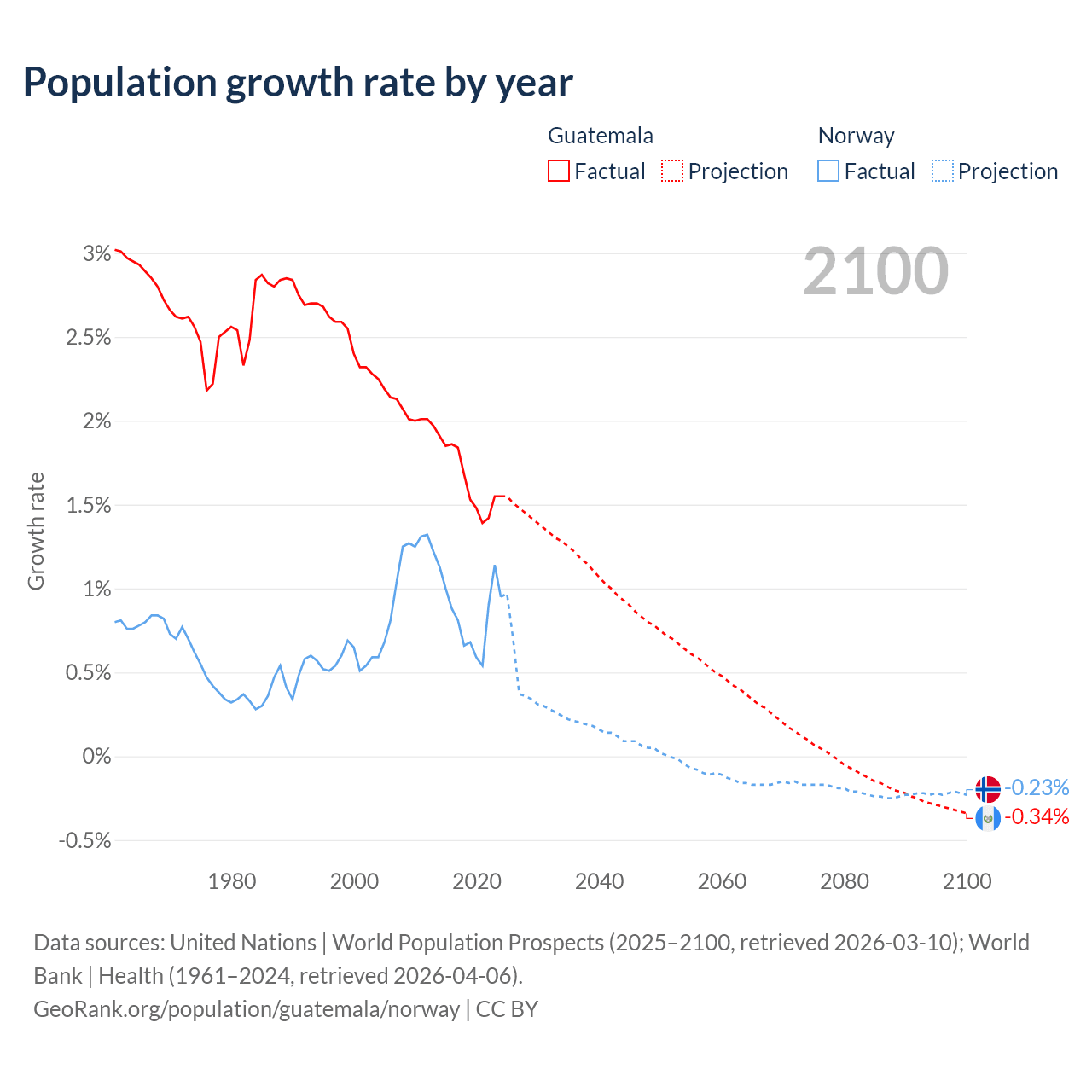 - For the last 10 years, Guatemala has had an average growth rate of +1.64% per year vs +0.85% in Norway.