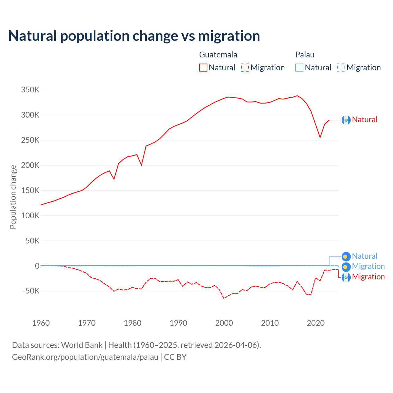 Over the last 10 years, 89.8% of the population change in Guatemala is from natural causes (a gain of 3,077,847 people) and 10.2% is from migration (a loss of 347,818 people). In Palau 53.8% is from natural causes (a gain of 264 people) and 46.2% is from migration (a loss of 227 people).