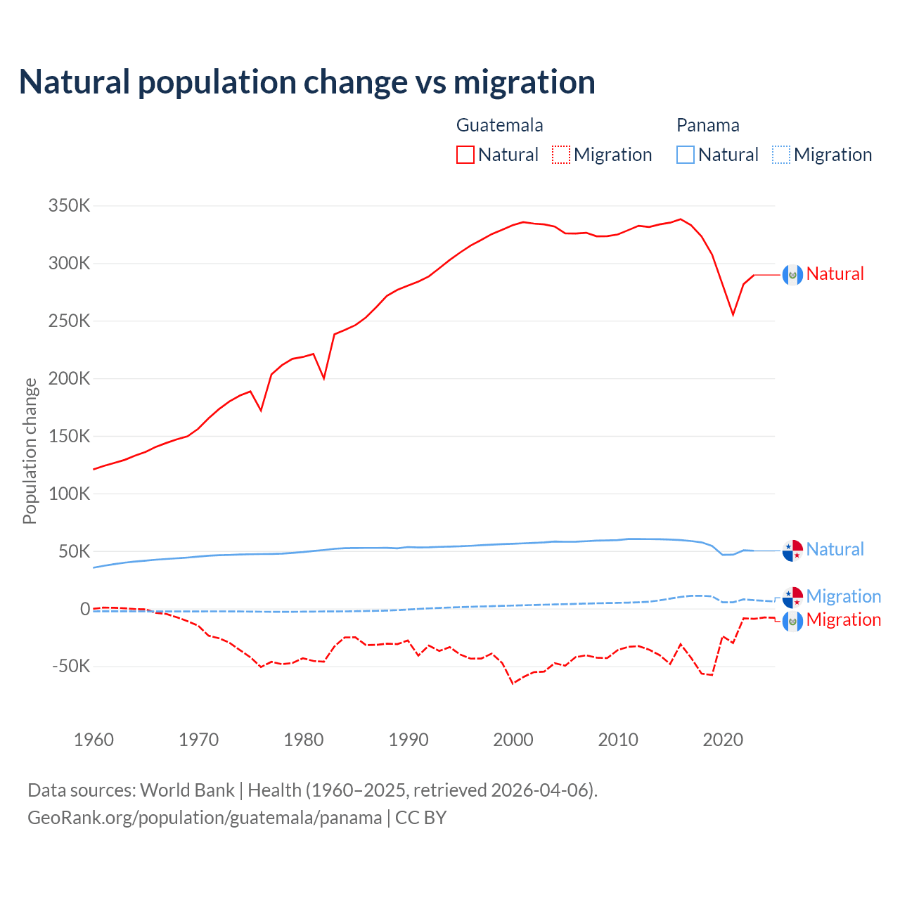 Over the last 10 years, 89.8% of the population change in Guatemala is from natural causes (a gain of 3,077,847 people) and 10.2% is from migration (a loss of 347,818 people). In Panama 86.5% is from natural causes (a gain of 544,211 people) and 13.5% is from migration (a gain of 84,849 people).