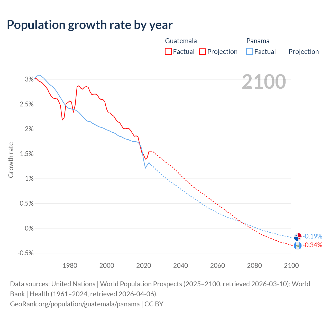 - For the last 10 years, Guatemala has had an average growth rate of +1.64% per year vs +1.52% in Panama.