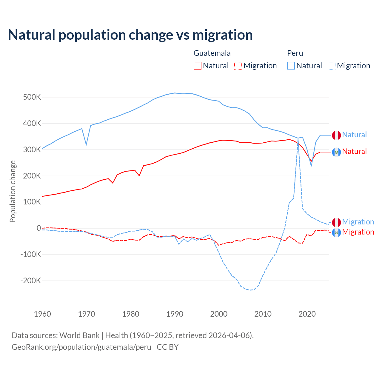 Over the last 10 years, 89.8% of the population change in Guatemala is from natural causes (a gain of 3,077,847 people) and 10.2% is from migration (a loss of 347,818 people). In Peru 82% is from natural causes (a gain of 3,345,822 people) and 18% is from migration (a gain of 732,505 people).
