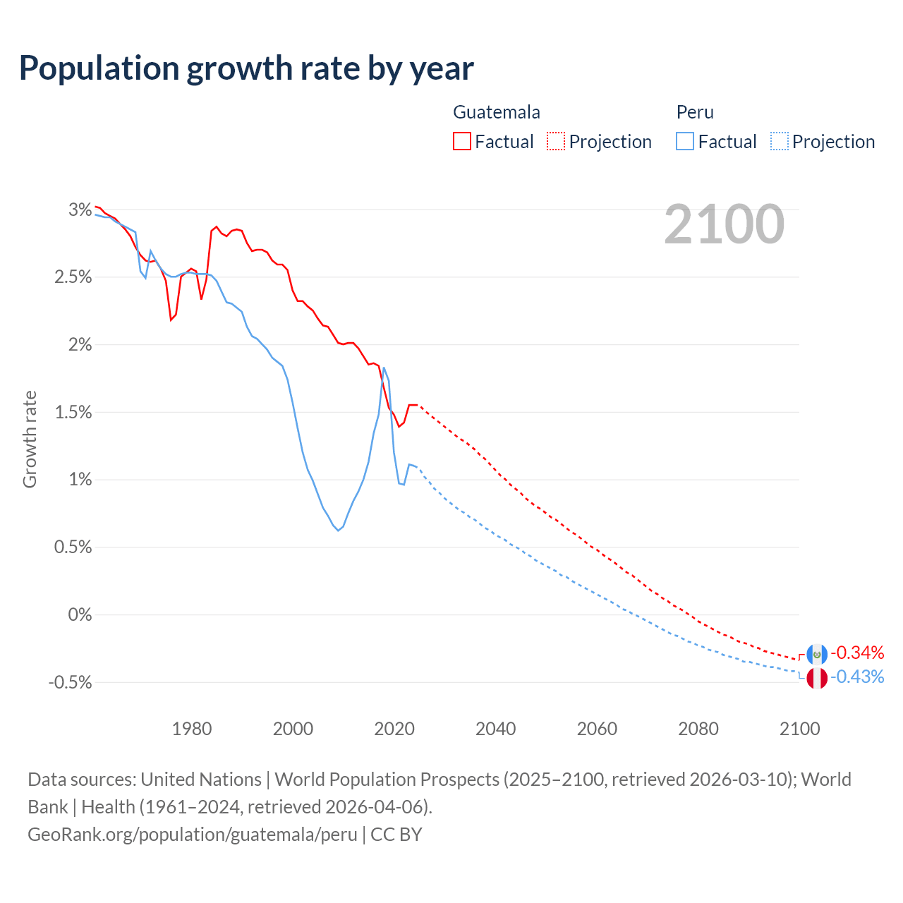 - For the last 10 years, Guatemala has had an average growth rate of +1.64% per year vs +1.26% in Peru.