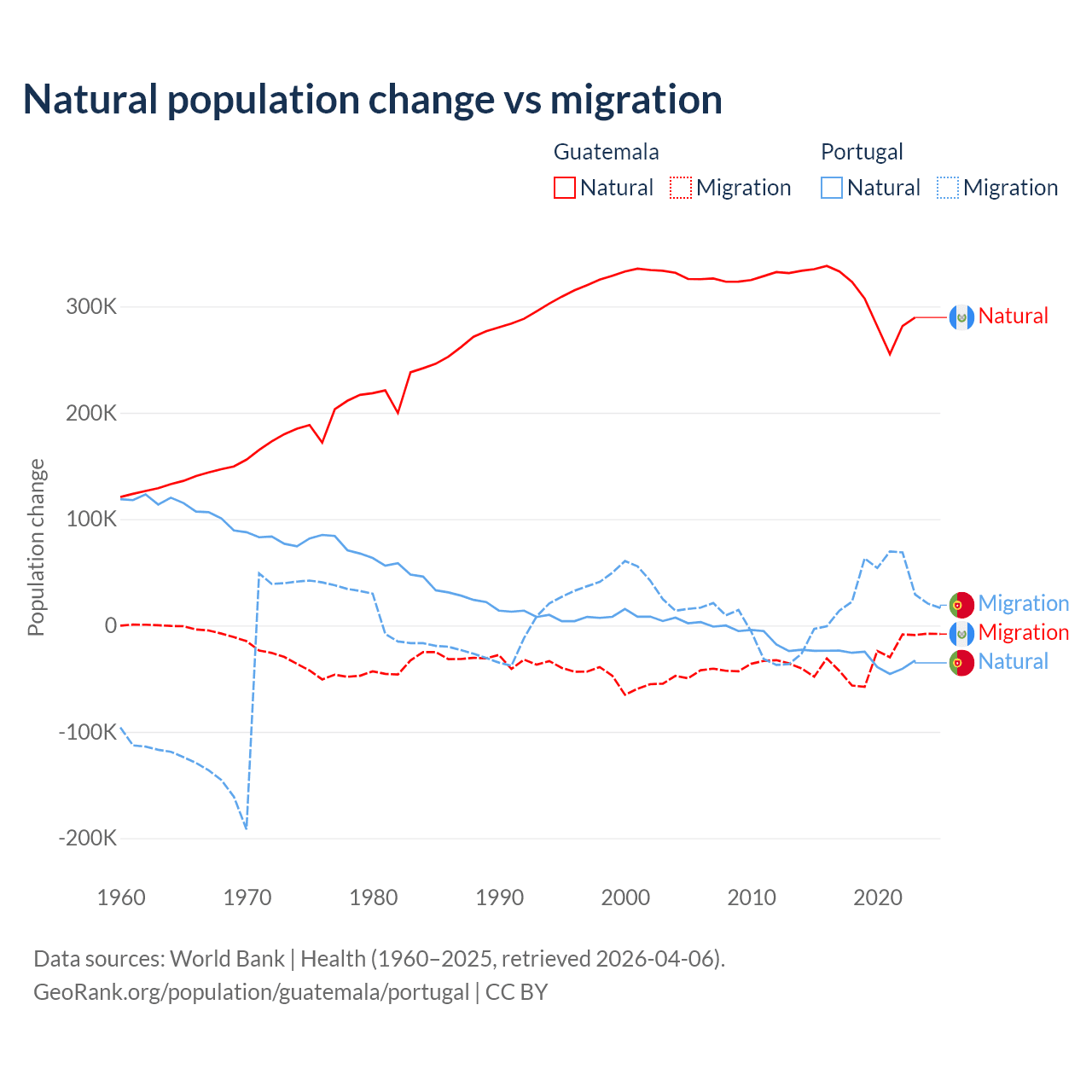 Over the last 10 years, 89.8% of the population change in Guatemala is from natural causes (a gain of 3,077,847 people) and 10.2% is from migration (a loss of 347,818 people). In Portugal 51% is from natural causes (a loss of 302,748 people) and 49% is from migration (a gain of 290,554 people).