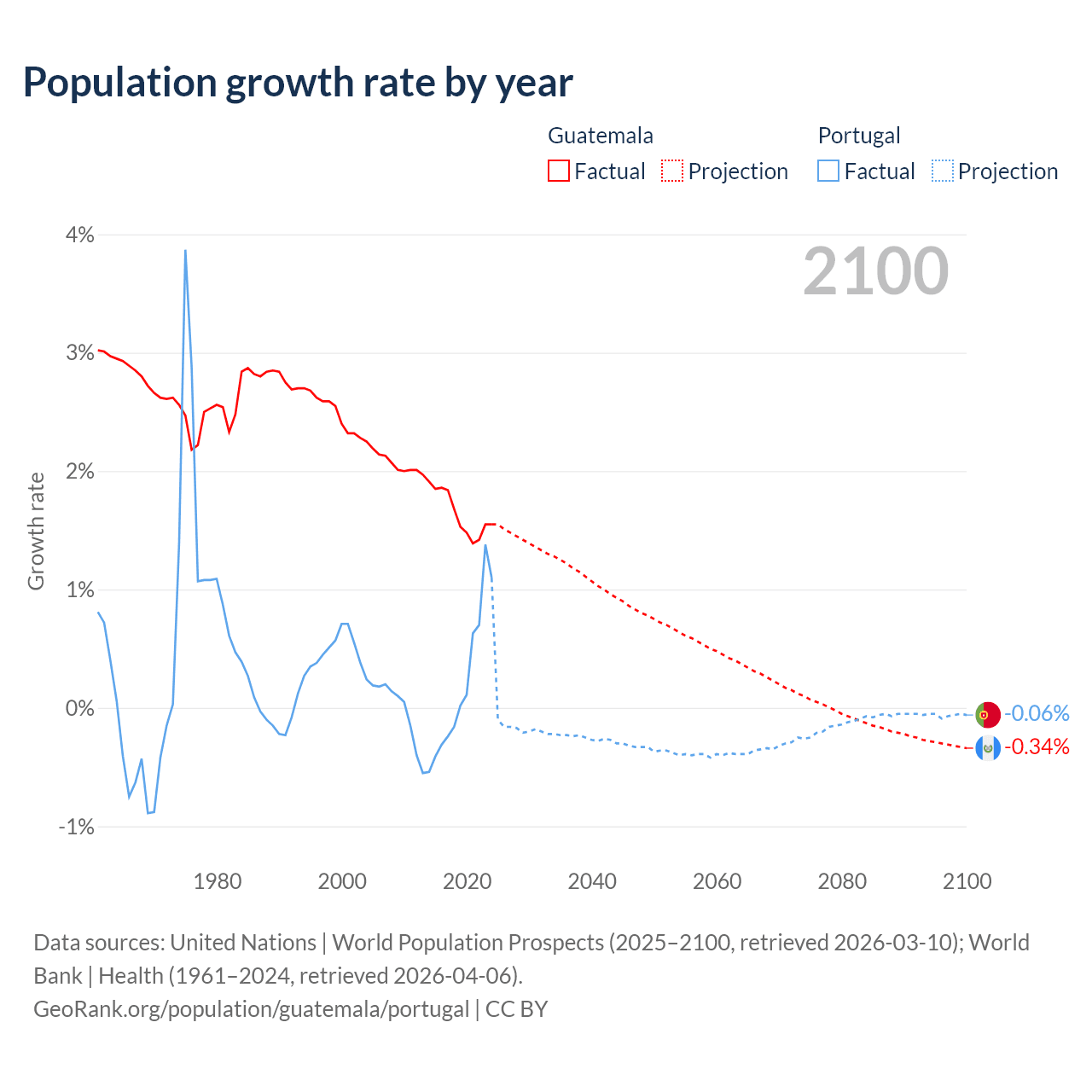- For the last 10 years, Guatemala has had an average growth rate of +1.64% per year vs +0.21% in Portugal.