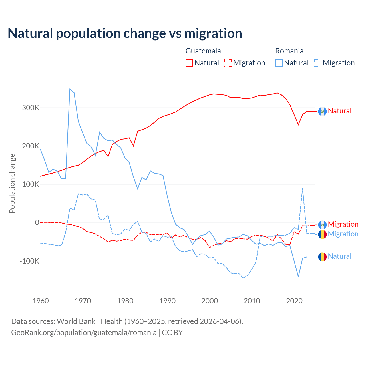 Over the last 10 years, 89.8% of the population change in Guatemala is from natural causes (a gain of 3,077,847 people) and 10.2% is from migration (a loss of 347,818 people). In Romania 82% is from natural causes (a loss of 766,295 people) and 18% is from migration (a loss of 167,917 people).