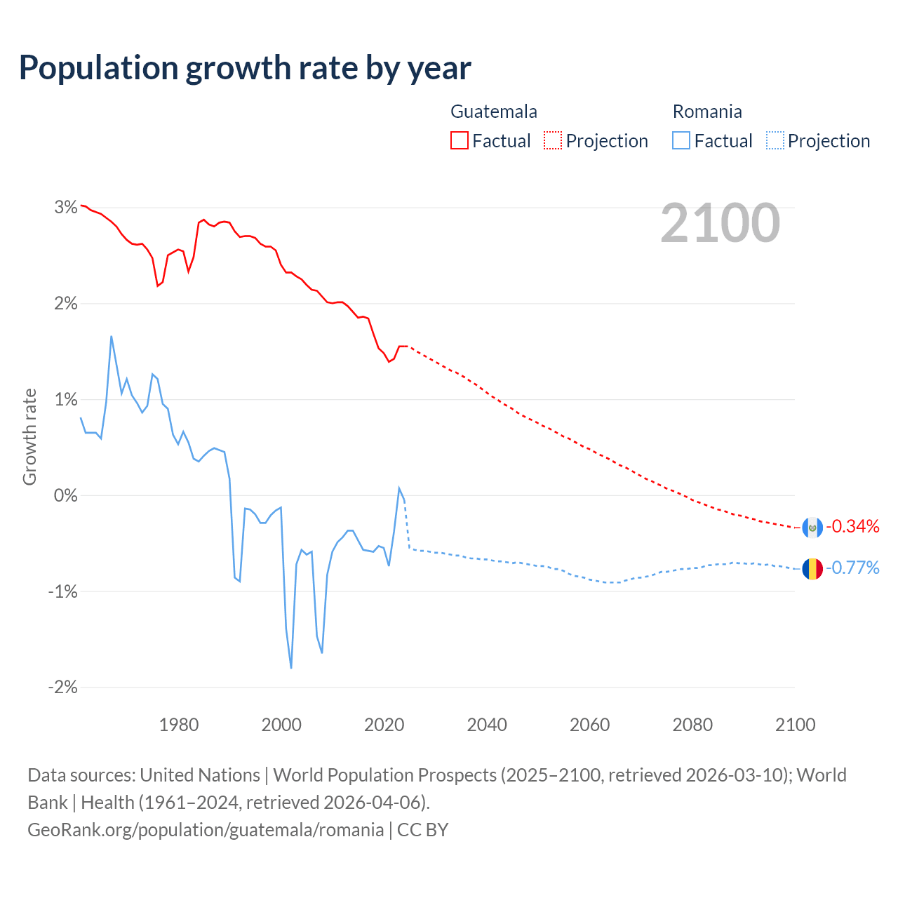 - For the last 10 years, Guatemala has had an average growth rate of +1.64% per year vs -0.43% in Romania.