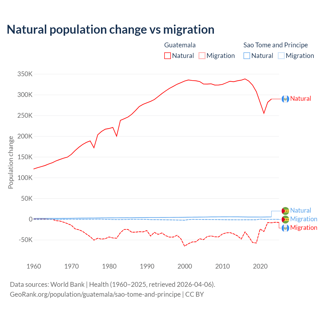 Over the last 10 years, 89.8% of the population change in Guatemala is from natural causes (a gain of 3,077,847 people) and 10.2% is from migration (a loss of 347,818 people). In Sao Tome and Principe 80.1% is from natural causes (a gain of 50,822 people) and 19.9% is from migration (a loss of 12,621 people).
